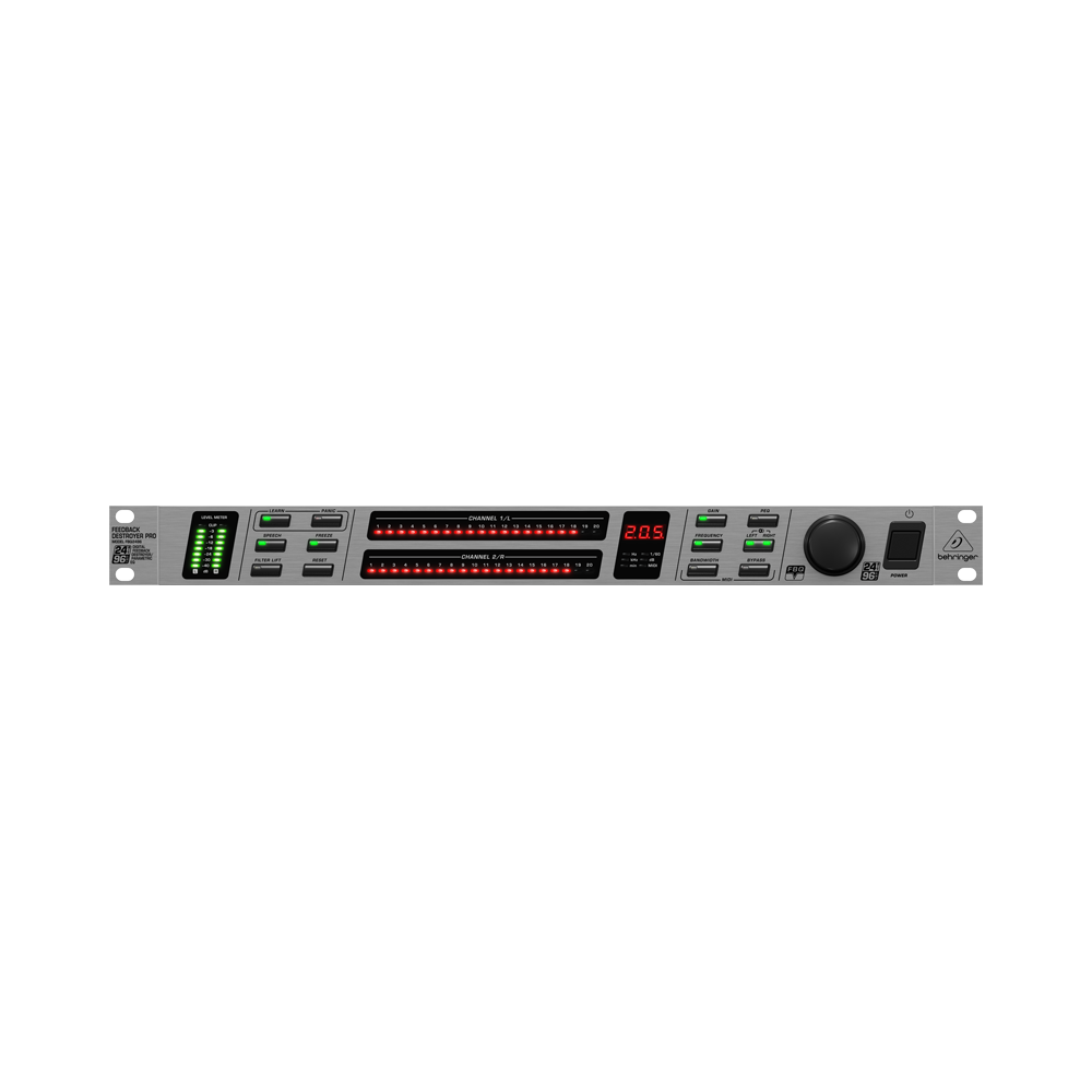 2-канальный подавитель обратной связи и 2х20 полосный параметрический эквалайзер. Сверхбыстрое подавление обратной связи (<0,2 с), cверхузкие (до 1/60 октавы) фильтры подавления, установка "set-and-forget" и кнопка Panic.