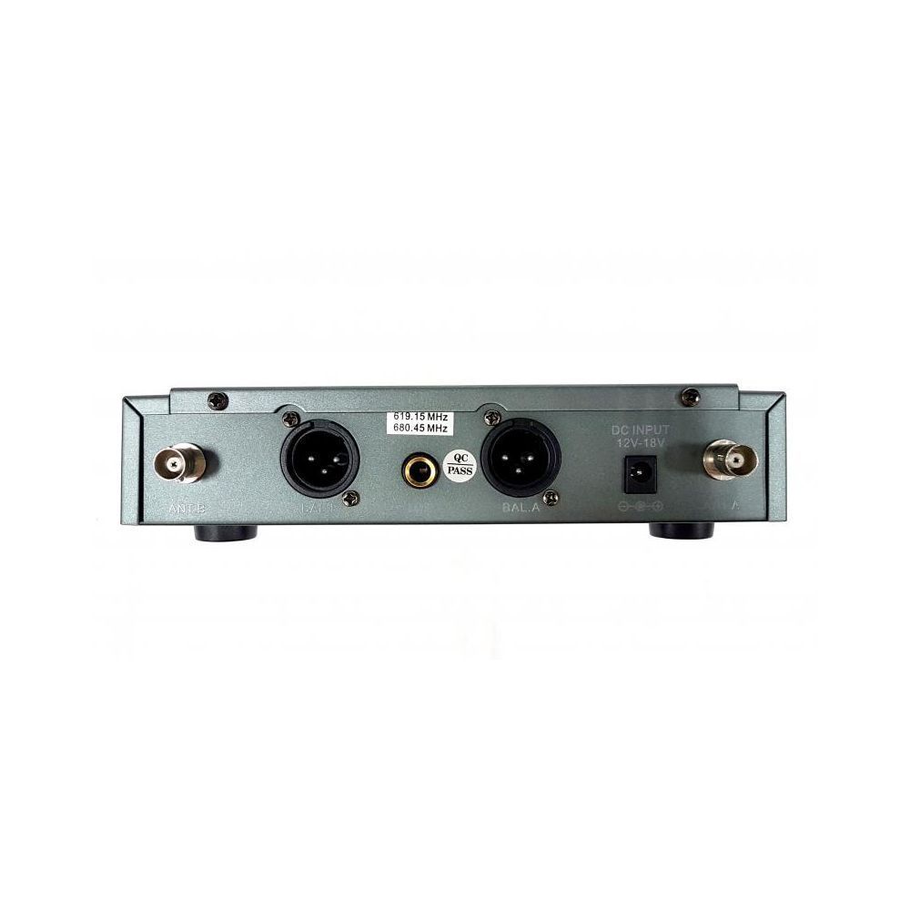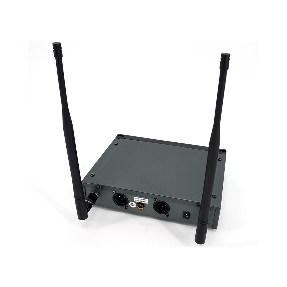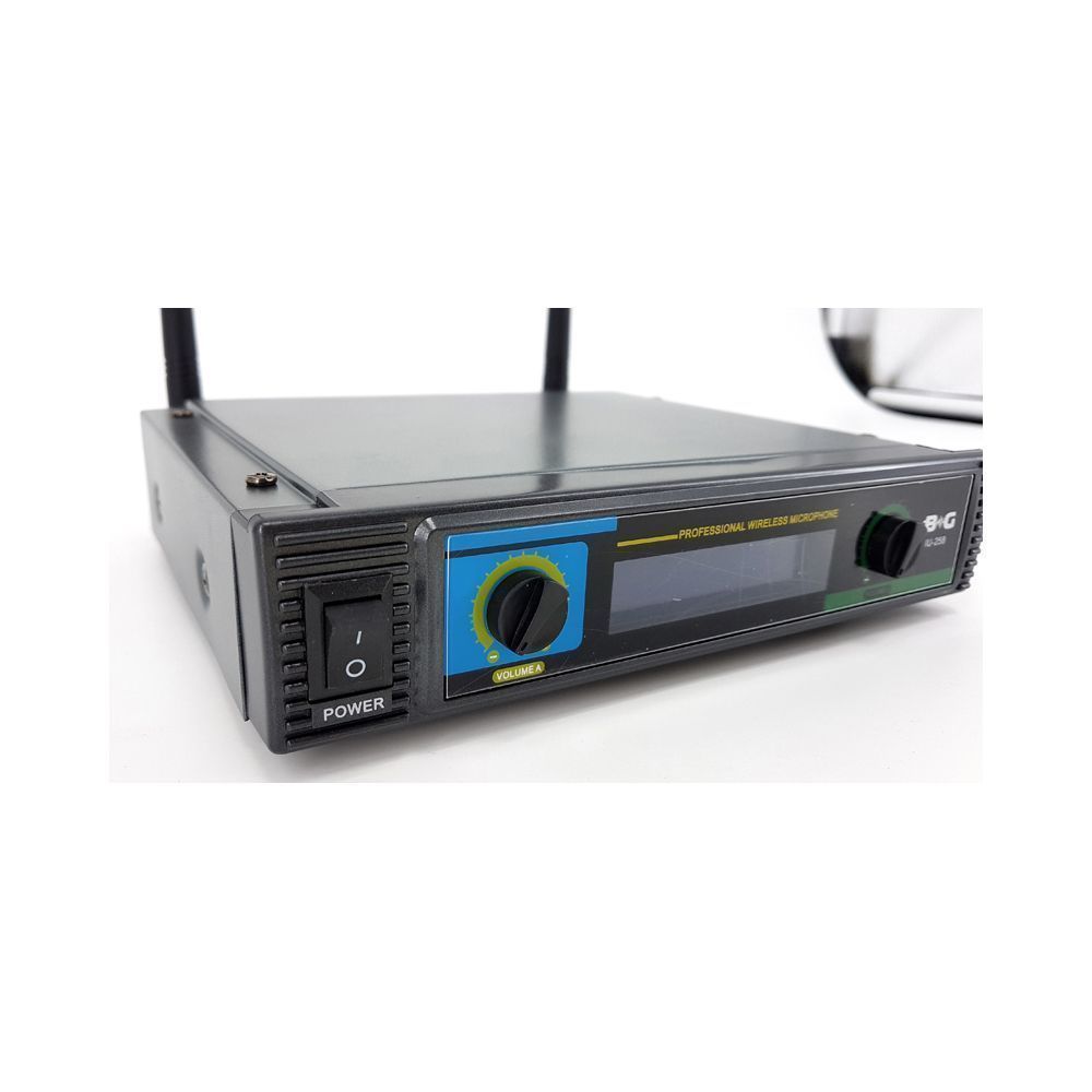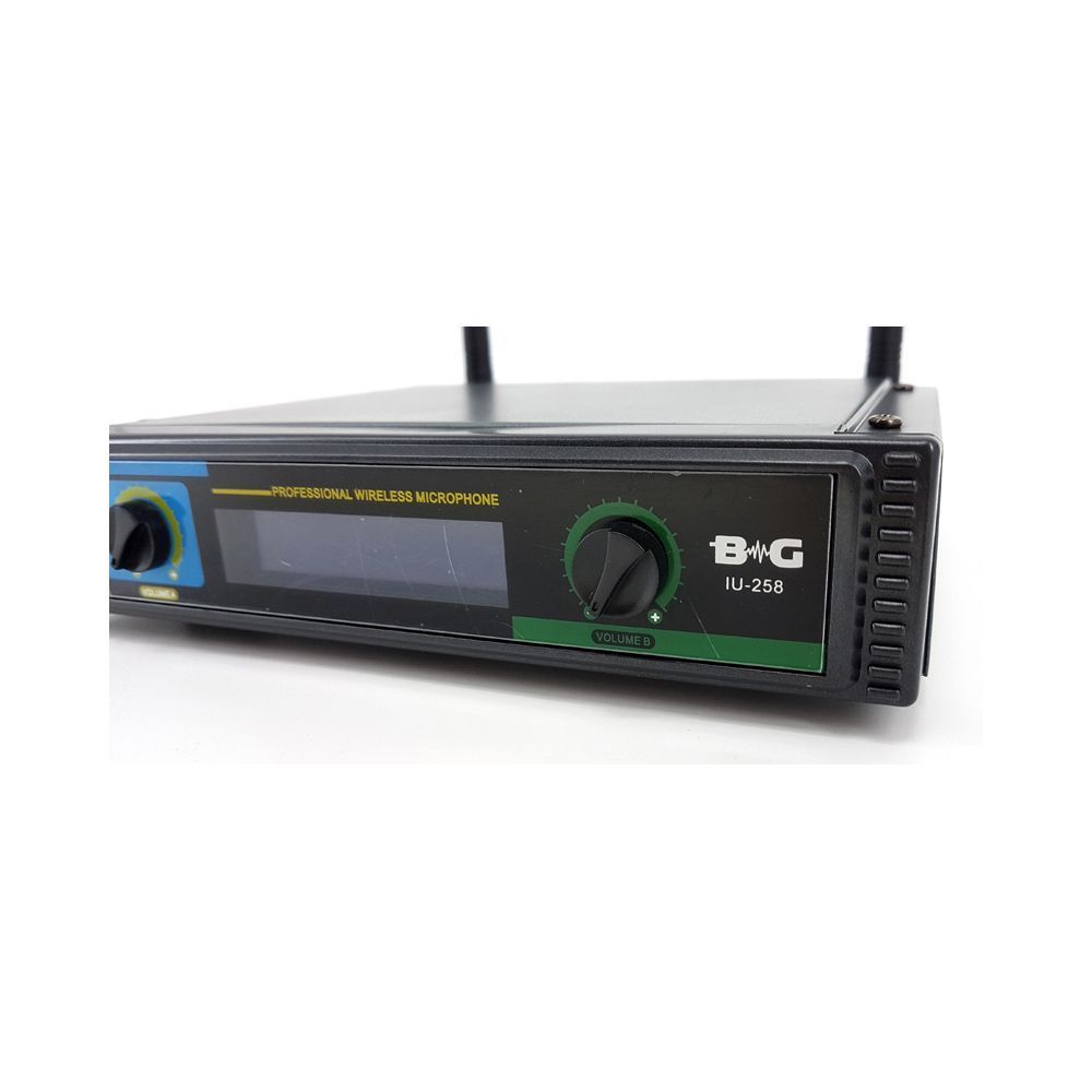 BG IU-258 представляет собой двухканальную вокальную радиосистему отличного качества. Озвучиваемый частотный диапазон радиосистемы лежит в спектре от 600 до 800 МГц. Комплектация: 1. Радиоприемник 2. Две антенны 3. Два беспроводных микрофона 4. Кабель Jack-Jack 5. Адаптер питания 6. Элементы питания типа АА х 4 Корпус радиоприемника представлен в прочном корпусе, на передней панели которого расположены элементы управления и ЖК-дисплей. Для качественного приема сигнала ресивер оснащен двумя антеннами. Энергообеспечение происходит с помощью адаптера. Беспроводные микрофоны обеспечивают защиту от обратной связи на сцене и меньшую чувствительность к посторонним звукам. Питание осуществляется от двух батареек типа АА, время работы может достигать 10 часов.