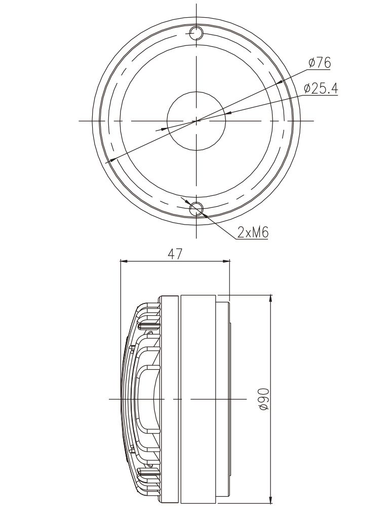 Выход: 1" (25,4 мм) Мощность: 40 Вт Сопротивление: 8 Ом Диаметр катушки: 1,4" (34 мм), алюминий, покрытый медью Чувствительность: 107 Дб Частотный диапазон: 1500 – 20 000 Гц Магнит: феррит Диафрагма: титан Общий диаметр: 90 мм Глубина: 47 мм Расстояние между крепежными отверстиями: 76 мм Вес: 0,9 кг