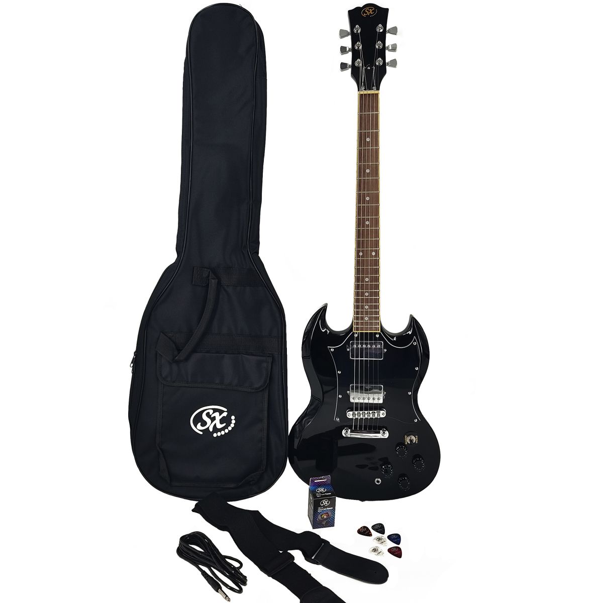 SX SE4-SK-BK Набор: электрогитара, корпус: ольха, гриф: клен, накладка: палисандр, 22 лада, контроллеры: 2 громкости, 2 тона, 3 позиционный переключатель, цвет: Black, кабель, ремень, тюнер, 6 медиаторов, чехол
